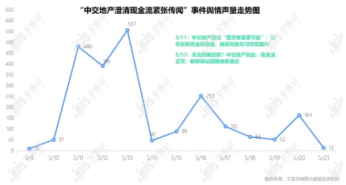 艾普思輿情大數(shù)據(jù)監(jiān)測(cè)系統(tǒng)顯示,“中交地產(chǎn)澄清現(xiàn)金流緊張傳聞”事件輿情聲量為2,283篇次,聲量峰值出現(xiàn)在5月13日(單日聲量557篇次);輿情聲量在5月12日中交地產(chǎn)回應(yīng)后急劇上升,于13日達(dá)到峰值后迅速回落。