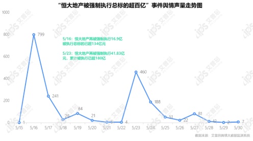 艾普思輿情大數(shù)據(jù)監(jiān)測(cè)系統(tǒng)顯示,“恒大地產(chǎn)被強(qiáng)制執(zhí)行總標(biāo)的超百億”事件輿情聲量為2,006篇次,聲量峰值出現(xiàn)在5月16日(單日聲量799篇次),第二個(gè)小高峰出現(xiàn)在5月23日,隨后聲量迅速回落,至5月30日降至7篇次。