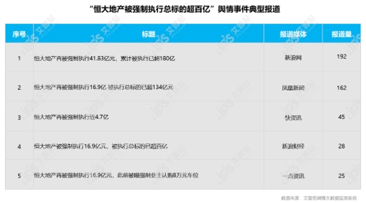 關(guān)于“恒大地產(chǎn)被強(qiáng)制執(zhí)行總標(biāo)的超百億”事件的典型報(bào)道包括《恒大地產(chǎn)再被強(qiáng)制執(zhí)行41.83億元,累計(jì)被執(zhí)行已超180億》《恒大地產(chǎn)再被強(qiáng)制執(zhí)行16.9億 被執(zhí)行總標(biāo)的已超134億元》《恒大地產(chǎn)再被強(qiáng)制執(zhí)行近4.7億》等,報(bào)道量排名前五的信息為:
