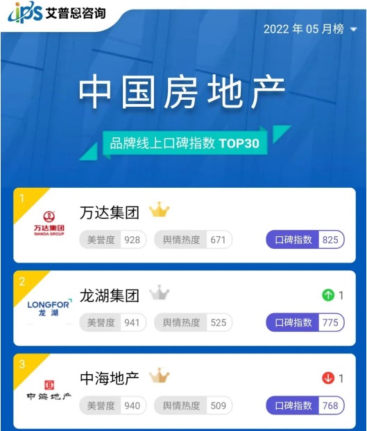 5月線上口碑指數(shù)位列前三的房地產(chǎn)品牌為:萬達(dá)集團(tuán)(825,排名與上月持平)、龍湖集團(tuán)(775,排名較上月上升1位)、中海地產(chǎn)(768,排名較上月下降1位)。三者的輿情熱度優(yōu)勢顯著,同時,美譽(yù)度指數(shù)均在900以上,正面信息占比分別達(dá)92.81%、94.13%、94.00%。