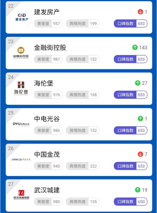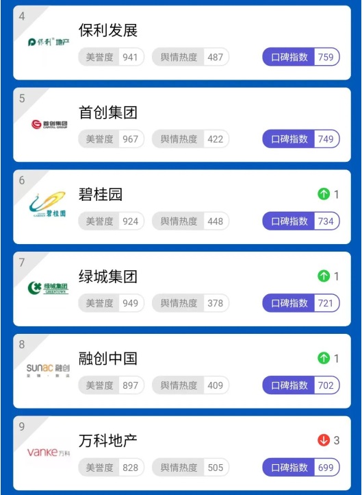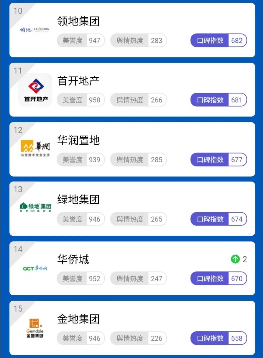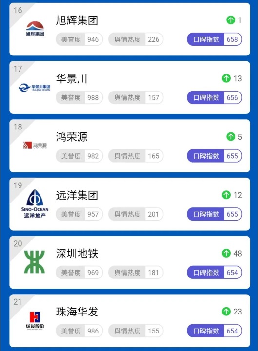 此外,華景川、遠(yuǎn)洋集團(tuán)的線上口碑指數(shù)分別提升13位、12位。