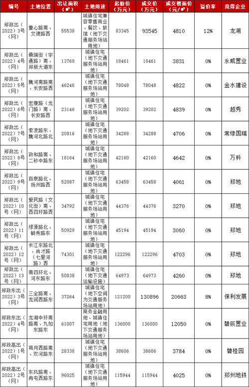 中指研究院的分析認(rèn)為,此次集中供地共計成交地塊15宗,分區(qū)域來看,管城區(qū)4宗、金水區(qū)3宗、中原區(qū)3宗、高新區(qū)2宗、鄭東新區(qū)2宗、惠濟(jì)區(qū)1宗,二七區(qū)、經(jīng)開區(qū)未有供地。其中10宗為城改定向地塊,5宗為公開出讓地塊,在這5宗公開地塊中,鄭政東出〔2022〕4號地需50%的產(chǎn)業(yè)導(dǎo)入,鄭政高出〔2022〕2號地需軌道交通相關(guān)要求,實際公開出讓地塊僅3宗。市場頗具看點(diǎn)的有兩宗土地,均溢價成交,分別為鄭政出〔2022〕3號地,由(龍湖)鄭州龍興房地產(chǎn)開發(fā)有限公司競得,溢價率為12%;鄭政東出〔2022〕3號地,由河南保利發(fā)展有限公司摘得,溢價為8%;中原區(qū)地塊0溢價成交。而在10宗城改地塊中,其中有超過一半土地為鄭州國企及平臺公司摘得,政府托底意圖明顯。
