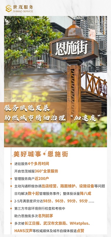 以高品質(zhì)服務(wù)助力城市管理高質(zhì)量發(fā)展,恩施街的煥然一新,就是一個(gè)縮影,世茂服務(wù)積極拓寬多元服務(wù)業(yè)態(tài),不斷優(yōu)化提升服務(wù)品質(zhì),致力通過服務(wù)加快助力城市美好煥新,為高品質(zhì)的城市生活增彩添綠。