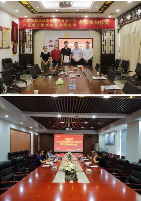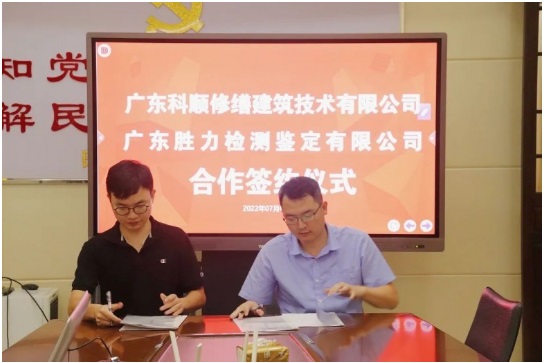 ▲雙方舉行了簽約儀式,共同簽署了《廣東勝力檢測鑒定有限公司與廣東科順修繕建筑技術(shù)有限公司的合作協(xié)議書》