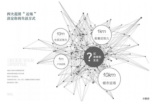 卓越集團(tuán)在調(diào)研中發(fā)現(xiàn),每個(gè)人的生活體驗(yàn)由他所在的10KM(事業(yè))、1KM(配套)、10M(社區(qū))和1M(家庭)范圍內(nèi)的空間和人物決定。四種日常軌跡到達(dá)的距離和場(chǎng)所為業(yè)主創(chuàng)造了最主要的生活、工作、社交場(chǎng)景,每個(gè)距離都對(duì)應(yīng)代表客戶的空間需求。