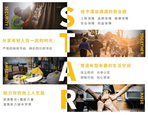 在產(chǎn)品與服務(wù)上,越秀住房租賃公司及越秀星寓品牌獨(dú)特的”S-T-A-R”星體系,溫情助力城市青年的生活與夢(mèng)想。在安全管理上,構(gòu)建工程、品質(zhì)、健康、安全、權(quán)益等五環(huán)24小時(shí)保障,給城市漂泊的年輕人滿滿的安全感(Security);在社群運(yùn)營(yíng)上,用嚴(yán)格的租客篩選、精彩的社群活動(dòng)讓年輕人匯聚,互相分享年輕人在一起的時(shí)光(Together);在公寓居住空間上,用獨(dú)立的房間共享的公區(qū)(影音區(qū)、健身房、桌球臺(tái)等配套),營(yíng)造有型有趣(Amazing)的生活空間;在助力年輕人夢(mèng)想上,對(duì)內(nèi)整合越秀集團(tuán)資源,對(duì)外引進(jìn)優(yōu)質(zhì)服務(wù)資源,例如與廣州市青創(chuàng)中心公益共建的“灣區(qū)青年驛站”,助力年輕人向上人生路(Raise)。