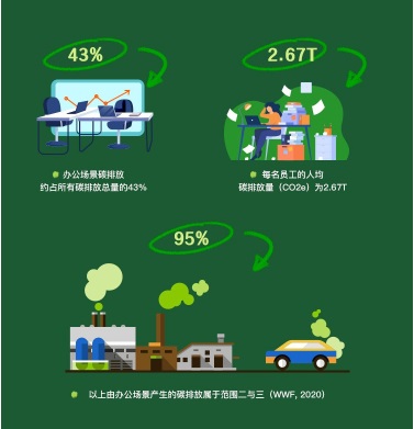 辦公場所作為“第二空間”,每個(gè)職場人在此會(huì)度過的時(shí)間約占生命的1/3,是人類除去睡眠之外耗費(fèi)最長的時(shí)段。因此,辦公場景下的碳排放量足夠可觀。