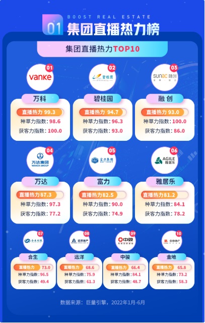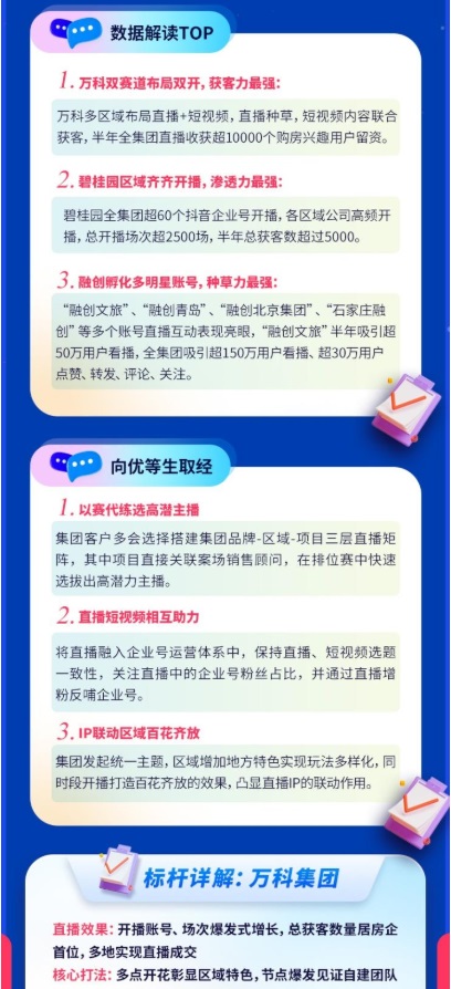 2022年,萬(wàn)科集團(tuán)在集團(tuán)直播熱力榜單中名列前茅,在直播排位賽中更是以多區(qū)域布局直播+短視頻形式脫穎而出,開(kāi)播賬號(hào)、場(chǎng)次呈爆發(fā)式增長(zhǎng),半年全集團(tuán)收獲了超10000個(gè)購(gòu)房興趣用戶留資。