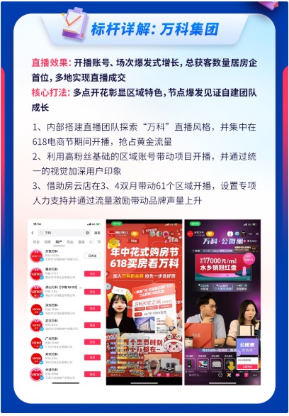 具體來(lái)看,首先萬(wàn)科集團(tuán)內(nèi)部搭建了直播團(tuán)隊(duì),持續(xù)探索萬(wàn)科特色直播風(fēng)格。在618期間,“廣州萬(wàn)科”、“東莞萬(wàn)科”、“武漢萬(wàn)科”等三十五個(gè)賬號(hào)響應(yīng)集團(tuán)號(hào)召進(jìn)行開(kāi)播,搶占節(jié)點(diǎn)黃金流量和用戶關(guān)注。其次,為強(qiáng)化項(xiàng)目參與度,以高粉絲區(qū)域賬號(hào)帶動(dòng)項(xiàng)目賬號(hào)開(kāi)播形式,同時(shí)在直播間統(tǒng)一視覺(jué)風(fēng)格讓品牌深入用戶心智。最后,萬(wàn)科借助房云店產(chǎn)品,帶動(dòng)61個(gè)區(qū)域開(kāi)播,設(shè)置專項(xiàng)人力支持并通過(guò)流量激勵(lì)進(jìn)一步促使品牌聲量上升。集團(tuán)直播排位賽,直播+短視頻助力,多區(qū)域矩陣聯(lián)動(dòng),助力萬(wàn)科集團(tuán)實(shí)現(xiàn)品效合一,精準(zhǔn)獲客。
