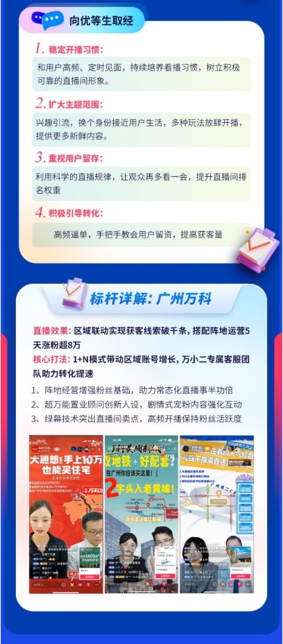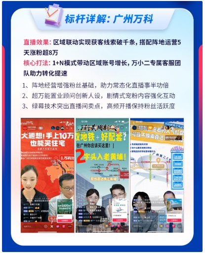 縱觀開(kāi)發(fā)商直播熱力榜單,作為全能型選手的廣州萬(wàn)科,也帶來(lái)了一套全新的房產(chǎn)行業(yè)直播方法論,通過(guò)“1區(qū)域號(hào)+N項(xiàng)目號(hào)+1客服號(hào)”的賬號(hào)矩陣,促進(jìn)廣州萬(wàn)科聲量和粉絲齊增長(zhǎng)。