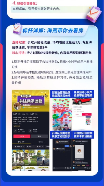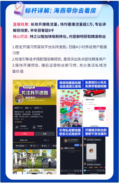 回看經(jīng)紀(jì)人直播熱力榜單,上榜佼佼者“海燕帶你去看房”通過(guò)循序漸進(jìn)的吸粉模式穩(wěn)定增粉,以長(zhǎng)效開(kāi)播的形式積累流量,實(shí)現(xiàn)場(chǎng)均看播流量超1萬(wàn)。在開(kāi)播上,通過(guò)賬號(hào)日播4小時(shí)養(yǎng)成用戶看播習(xí)慣,以穩(wěn)定的開(kāi)播習(xí)慣贏取平臺(tái)扶持激勵(lì)。在直播中,用標(biāo)準(zhǔn)引導(dǎo)話語(yǔ)搭配強(qiáng)吸睛視覺(jué),直觀地突出賣點(diǎn)留住精準(zhǔn)用戶。同時(shí)“海燕帶你去看房”為加強(qiáng)私域建設(shè),也會(huì)保持開(kāi)播預(yù)告、播后運(yùn)營(yíng)粉絲群的習(xí)慣,充分激活私域流量?jī)r(jià)值。
