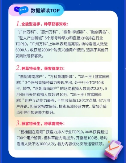 在此次開(kāi)發(fā)商直播熱力榜單中,“廣州萬(wàn)科”、“惠州萬(wàn)科”、“泰魯·李超群”、“融創(chuàng)青島”、“駝人產(chǎn)業(yè)新城”等賬號(hào)以其高種草力和高獲客力強(qiáng)勢(shì)排入TOP10!皬V州萬(wàn)科”位居榜首,場(chǎng)均看播人數(shù)近6000人,半年收獲超2000個(gè)購(gòu)房興趣用戶留資,獲客力表現(xiàn)十分亮眼。而“燕妮海南房產(chǎn)”在開(kāi)發(fā)商賬號(hào)中種草力最強(qiáng),其場(chǎng)均看播人數(shù)高達(dá)2.8萬(wàn),5月4日當(dāng)天的看播人數(shù)超過(guò)10萬(wàn)。