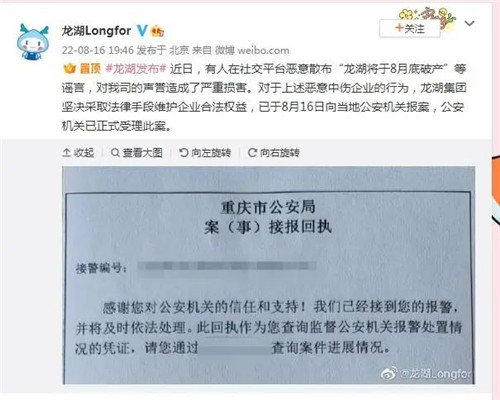 房訊網(wǎng)訊 8月16日晚間,龍湖集團(tuán)官方微博發(fā)文稱,近日,有人在社交平臺(tái)惡意散布“龍湖將于8月底破產(chǎn)”等謠言,對(duì)我司的聲譽(yù)造成了嚴(yán)重?fù)p害。對(duì)于上述惡意中傷企業(yè)的行為,龍湖集團(tuán)堅(jiān)決采取法律手段維護(hù)企業(yè)合法權(quán)益,已于8月16日向當(dāng)?shù)毓矙C(jī)關(guān)報(bào)案,公安機(jī)關(guān)已正式受理此案。