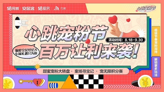 百萬鉅惠,心跳來襲!8月18日-9月30日,由58同城、安居客、58愛房和巧房共同發(fā)起的“818心跳寵粉節(jié)”活動盛大開啟。本次活動將聚焦用戶看房、選房、訂房核心場景升級,緊緊圍繞經(jīng)紀人線上數(shù)字化營銷需求,通過全面升級互動玩法、創(chuàng)新活動落地形式、百萬鉅惠送福利等方式,全面助力B端合作伙伴提升機構(gòu)交互粘性,以節(jié)日營銷+造節(jié)氛圍,結(jié)合運營政策讓利為合作機構(gòu)及KA機構(gòu)賦能,全面助力C端用戶安心鉅惠選好房!
