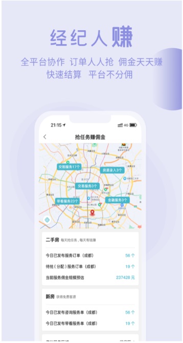 亮點(diǎn)4:超低端口費(fèi)+平臺(tái)不分傭—通過搶單模式經(jīng)紀(jì)人在平臺(tái)獲得訂單后開始服務(wù),服務(wù)結(jié)束后由服務(wù)對(duì)象在線提交服務(wù)反饋,平臺(tái)根據(jù)服務(wù)結(jié)果反饋把相應(yīng)的服務(wù)費(fèi)用結(jié)算給經(jīng)紀(jì)人,結(jié)算傭金時(shí)間更短,同時(shí),平臺(tái)除收取經(jīng)紀(jì)人入會(huì)費(fèi)用(約1元/天)以外,后期不會(huì)對(duì)經(jīng)紀(jì)人在發(fā)布房源、推廣位置等常用功能環(huán)節(jié)設(shè)置收費(fèi),無論新房還是二手房平臺(tái)不分傭、扣傭,讓經(jīng)紀(jì)人(公司)的收益最大化。