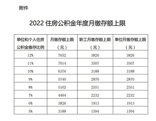 2022住房公積金年度繳存比例為5%-12%,單位可自主選擇。具體繳存比例對應(yīng)月繳存額上限為: