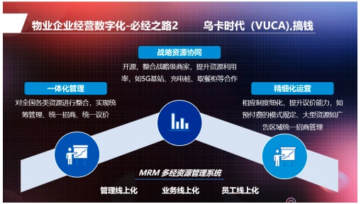 “第二個必經(jīng)之路,物業(yè)企業(yè)經(jīng)營數(shù)字化,特別是在烏卡時代(VUCA ,是volatile,uncertain,complex,ambiguous的縮寫,四個單詞分別是易變不穩(wěn)定、不確定、復雜和模糊的意思),一定要產(chǎn)生商業(yè)價值。在這里我也跟大家分享一下去年在長城物業(yè)上線的一個資源管理系統(tǒng),實現(xiàn)了全國所有經(jīng)營資源一體化的管理。通過這個資源整合之后,對應的商家或者是資源服務提供商進行協(xié)同,最后就形成精細化的管理、協(xié)同化的管理。我們都知道物業(yè)項目里面經(jīng)營資產(chǎn)是非常分散的,比如基站,比如空間的出租,比如飲水機,比如自動售貨柜等,以前全部是掌握在管家或者是項目經(jīng)理手上,現(xiàn)在可以集約化的經(jīng)營!