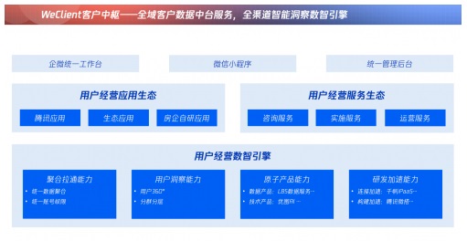 “我們也在思考騰訊應該怎么去做,這里我們總結出來幾個關鍵點,第一是我們比較擅長做平臺,平臺幫助我們的集團企業(yè)實現(xiàn)更好的數(shù)據(jù)拉通,構建基礎底座。我們要建立生態(tài)的連接,同時把我們的開放連接能力發(fā)揮到極致。基于此,我們在上半年發(fā)布了一款地產(chǎn)用戶經(jīng)營平臺WeClient!