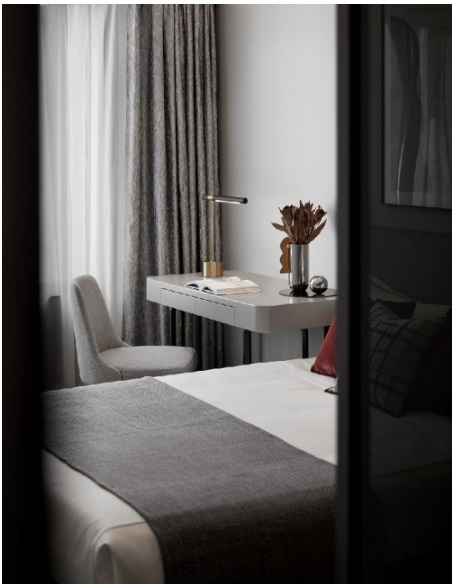 二層主臥克制守序,色調(diào)柔和,氛圍舒心,家具、用色和裝飾美學(xué)混用,不管窗外如何喧囂吵鬧、紅塵紛擾,你只想沉浸于此。它不僅是身體的?刻,更是精神的棲息地。而位于主臥的書(shū)房,在干練中透著一股英氣,就像一位君子,沉靜而雅致,自由而獨(dú)立。