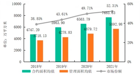 圖:2018-2021年百?gòu)?qiáng)企業(yè)合約面積、管理面積及市場(chǎng)份額變化情況