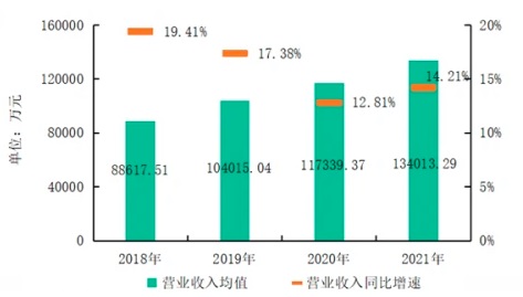圖:2018-2021年百?gòu)?qiáng)企業(yè)營(yíng)業(yè)收入均值與增速情況