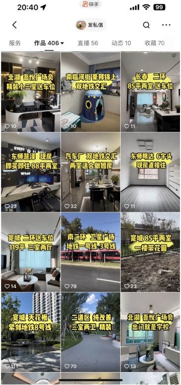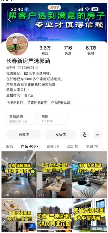 但像這種改善性需求的購房客戶只是少數(shù),在郭涵看來,快手用戶年齡很符合市場(chǎng)的購房群體,長(zhǎng)春外五縣,以及一些周邊城市的人們基本都在玩快手,“來找我購房的也是外地群體偏多,基本都是希望為在長(zhǎng)春學(xué)習(xí)、工作的孩子購房,想讓他們盡快安定下來的家長(zhǎng)”。