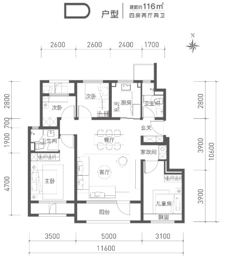 建面約116㎡四居南向面寬達(dá)11.6米,客廳5米面寬,比肩140㎡戶型的空間感受。陽臺(tái)、飄窗等拓展面積,將實(shí)際得房率拉到新高度。