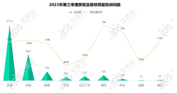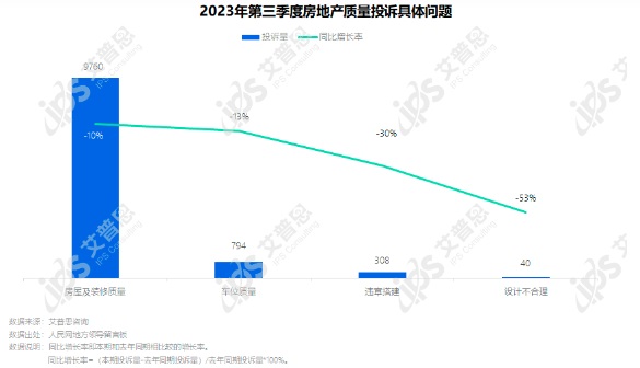 2023年第三季度,質(zhì)量投訴中房屋及裝修質(zhì)量相關(guān)投訴9760起,較去年同期下降10%;車位質(zhì)量相關(guān)投訴794起,較去年同期下降13%;違章搭建、設(shè)計不合理相關(guān)投訴分別為308起、40起。