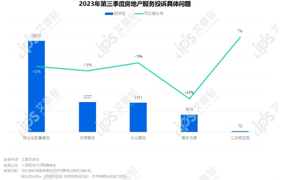 服務(wù)類投訴中,物業(yè)及配套服務(wù)投訴量9800起,較去年同期下降13%,其中物業(yè)不作為、亂使用維修基金相關(guān)投訴較多;交房服務(wù)投訴3227起,較去年同期下降16%,主要涉及延期交房;辦證服務(wù)投訴量3151起,較去年同期下降11%,主要投訴問題為無法辦理房產(chǎn)證;服務(wù)態(tài)度相關(guān)投訴1876起,較去年同期下降35%,工作人員辦事推脫、拖延相關(guān)投訴較多。