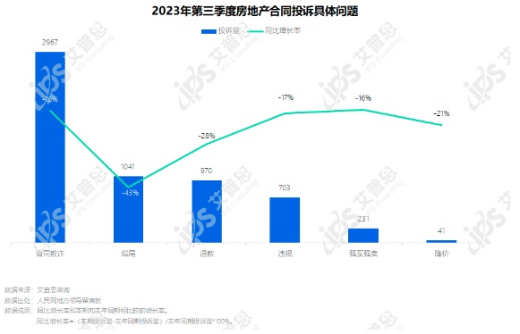 2023年第三季度,合同類投訴中合同欺詐投訴量2967起,較去年同期下降16%,主要涉及面積縮水、虛假宣傳等問題;爛尾投訴1041起,較去年同期下降43%;退款投訴970起,較去年同期下降28%。違規(guī)、強(qiáng)買強(qiáng)賣、降價相關(guān)投訴較去年同期分別下降17%、16%、21%。