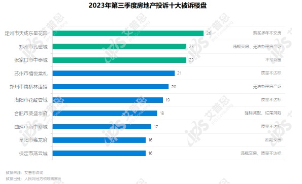 2023年第三季度被投訴最多的樓盤為定州市天成東星花園,共收到投訴26起,主要投訴問題為購買多年不交房。