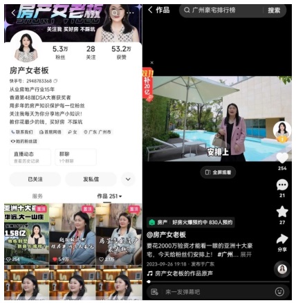 “在珠三角地區(qū),快手的直播賣房真的行得通嗎?賬號(hào)流量效果向好,后續(xù)真的會(huì)有可觀的生意轉(zhuǎn)化嗎?”2022年底,廣州房產(chǎn)主播“房產(chǎn)女老板”(快手ID:2948783368)盧文清在快手運(yùn)營了大半年,粉絲量就超過了2.3萬,即便心里藏著不少對(duì)快手房產(chǎn)生意轉(zhuǎn)化的疑慮,但盧文清依舊堅(jiān)持對(duì)快手運(yùn)營下功夫。