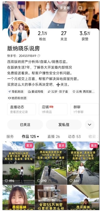 “通過短視頻和直播,客戶們能了解我,了解到西雙版納的房產(chǎn)情況!痹跁詷房磥,外地的用戶能夠基于快手平臺(tái)提前走進(jìn)西雙版納的房產(chǎn)市場,省去了交易前期的認(rèn)知過程。