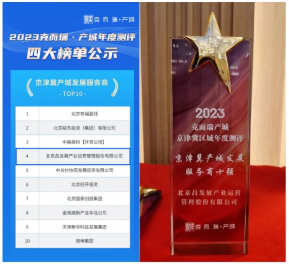2023年12月21日,克而瑞·產(chǎn)城公示了2023克而瑞·產(chǎn)城年度測(cè)評(píng)四大榜單,其中北京昌發(fā)展產(chǎn)業(yè)運(yùn)營(yíng)管理股份有限公司榮獲《京津冀產(chǎn)城發(fā)展服務(wù)商TOP10》,同獲獎(jiǎng)項(xiàng)的還有北京幸福藍(lán)線(xiàn)、北京聯(lián)東投資(集團(tuán))有限公司、中南高科(環(huán)京公司)、中關(guān)村協(xié)同發(fā)展投資有限公司等。