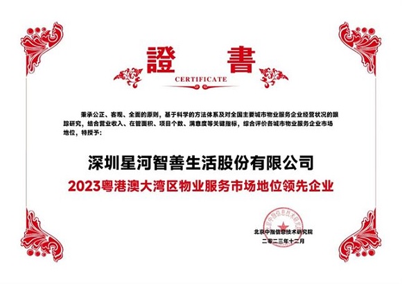 星河智善生活憑借業(yè)內(nèi)領(lǐng)先的綜合實(shí)力和服務(wù)水平,榮獲“2023粵港澳大灣區(qū)物業(yè)服務(wù)市場(chǎng)地位領(lǐng)先企業(yè)”、在管項(xiàng)目星河發(fā)展中心被評(píng)為“2023物業(yè)服務(wù)行業(yè)示范基地”。