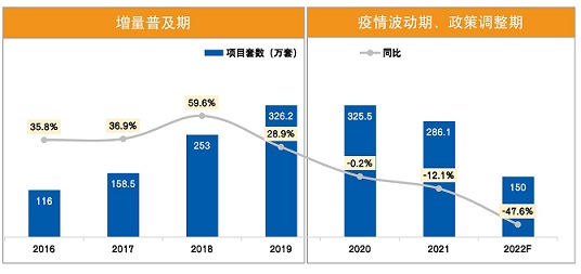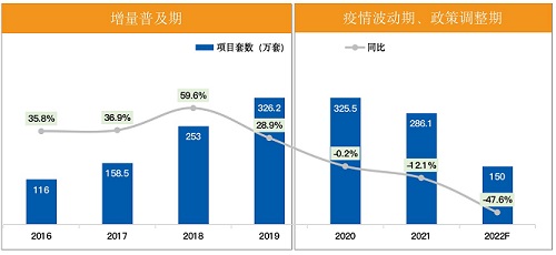 從舒適品類工程市場角度來看:2016-2019年中國精裝修市場經(jīng)歷高速增長期,平均增速超過40%,2020年受疫情大環(huán)境影響同比下滑僅0.2%,市場基本持平;2021年中國房地產(chǎn)市場經(jīng)歷了史無前例的政策打壓,加上疫情波動(dòng)期影響,2022年市場不達(dá)預(yù)期,2022年1-10月精裝修開盤樓盤精裝套數(shù)119萬套,同比-48%;