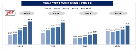 舒適部品正處于行業(yè)紅利期,配置率均保持持續(xù)上升趨勢,其中中央空調(diào)配置率近50%,熱水器、新風(fēng)系統(tǒng)配置率超過40%,凈水器超過20%,2018-2022年10月近五年時(shí)間,精裝市場舒適部品累計(jì)規(guī)模約1500萬套,未來將會(huì)迎來長足發(fā)展。