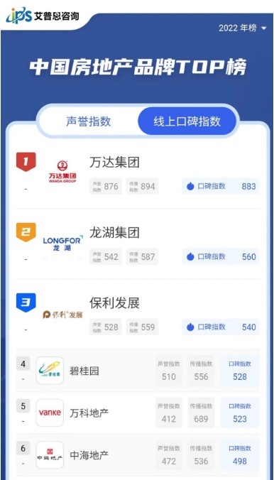 2022年線上口碑指數(shù)位列前三的房地產(chǎn)品牌為:萬達(dá)集團(tuán)(口碑指數(shù)883)、龍湖集團(tuán)(口碑指數(shù)560)、保利發(fā)展(口碑指數(shù)540)。其它上榜TOP50的房企包括:碧桂園、萬科地產(chǎn)、首創(chuàng)集團(tuán)、雅居樂集團(tuán)、招商蛇口、重慶兩江新區(qū)置業(yè)等。