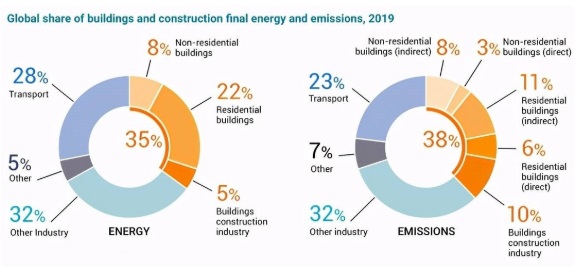 綠色發(fā)展是ESG指標(biāo)體系的核心,也是國(guó)際經(jīng)濟(jì)發(fā)展的主流趨勢(shì)。眾所周知,二氧化碳排放量的猛增是影響全球氣候變暖的主因。但鮮為人知的是,根據(jù)國(guó)際能源署和聯(lián)合國(guó)環(huán)境規(guī)劃署發(fā)布的《2020年全球建筑和建造業(yè)狀況報(bào)告》,2019年源自交通的碳排放量占全球總碳排放的23%,而建筑建造行業(yè)的碳排放卻占了總量的38%。