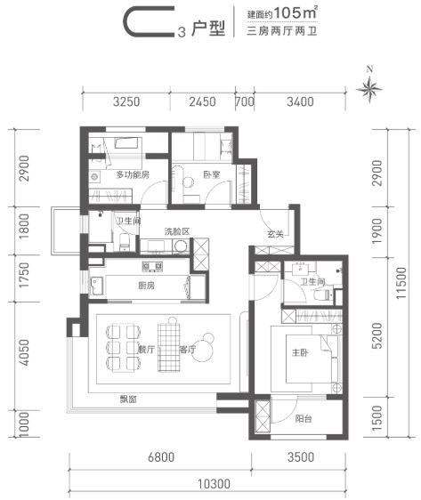 約105平米C3三居戶型是整個(gè)項(xiàng)目的創(chuàng)新之作,南向面寬約達(dá)10.3米,設(shè)計(jì)師大膽的將餐客廳旋轉(zhuǎn)了90度,讓室內(nèi)擁有一個(gè)面寬約6.8米、270°轉(zhuǎn)角飄窗的寬廳,堪比豪宅起居空間尺度。主臥套房配陽臺(tái),可融入多元生活場景,北向兩個(gè)房間可根據(jù)居家生活需求,自由組合?筒蛷N橫向布局,互動(dòng)交流更聚合。