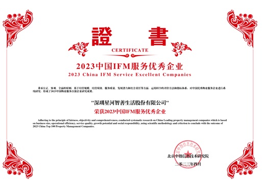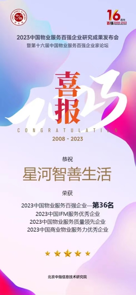 星河智善生活憑借業(yè)內(nèi)領(lǐng)先的綜合實力和服務(wù)水平,榮獲“2016-2023連續(xù)八年中國物業(yè)服務(wù)百強(qiáng)企業(yè)”、“2023中國IFM服務(wù)優(yōu)秀企業(yè)”、“2023中國專項物業(yè)服務(wù)力優(yōu)秀企業(yè)-商業(yè)物業(yè)”殊榮。