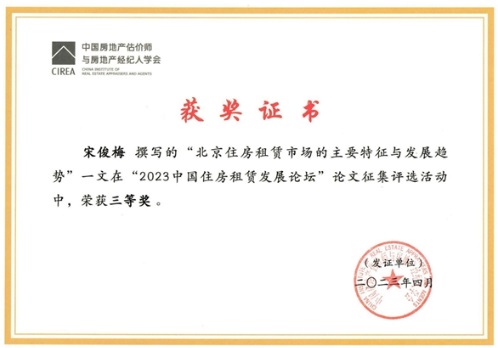 近日,在“2023中國住房租賃發(fā)展論壇論文征集活動”中,我愛我家研究院分析師宋俊梅提交的《北京住房租賃市場的主要特征與發(fā)展趨勢》榮獲三等獎,成為全國16篇獲獎論文之一。
