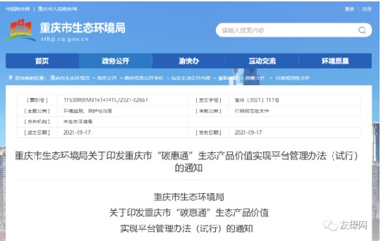 圖 1 重慶市生態(tài)環(huán)境局關(guān)于印發(fā)重慶市“碳惠通”生態(tài)產(chǎn)品價值實現(xiàn)平臺管理辦法 (試行)的通知