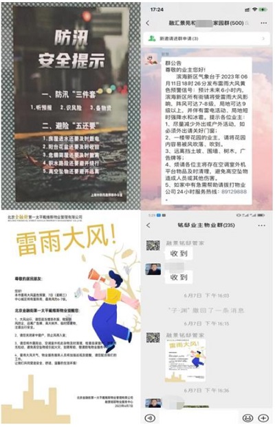 客服管家時刻關注當?shù)貧庀蟛块T預警信息,通過業(yè)主微信群、公告欄、電梯前示等形式提前向業(yè)主發(fā)布溫馨提醒,同時加強項目空置房巡查,細致的貼心服務深受業(yè)主好評。
