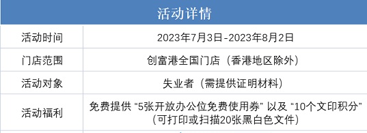 值得注意的是,該活動(dòng)在提供免費(fèi)辦公位的同時(shí),還將附贈(zèng)10個(gè)文印積分,可在創(chuàng)富港門(mén)店中打印或掃描20張黑白文件,該舉措也為用戶(hù)提供持續(xù)的便利和溫暖。