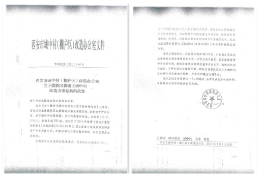據(jù)葛林給記者提供的資料顯示,后在2010年,宏潤(rùn)地產(chǎn)和穆將王商貿(mào)有限公司(原穆將王村委會(huì)無形改造后成立的集體企業(yè))簽訂了《穆將王城中村改造聯(lián)合開發(fā)合同修訂協(xié)議書》,將2008年1月批復(fù)的城改綜合用地297.6畝調(diào)整為420畝;原合同約定的18萬平方米的安置用房調(diào)整為地上13萬平方米住宅用房和地上2萬平方米的獨(dú)立商業(yè)用房;同時(shí)將原合同約定的2500萬元拆遷補(bǔ)償款調(diào)整為1.4億元,后報(bào)請(qǐng)西安市城改辦審核。2011年3月,西安市城改辦下發(fā)了市城改發(fā)〔2011〕44號(hào)《關(guān)于灞橋區(qū)穆將王村城中村改造方案結(jié)轉(zhuǎn)的批復(fù)》,同意將綜合改造用地調(diào)整為420畝。葛林向記者出示了2008年城中村改造實(shí)施方案批復(fù)和2011年城改方案結(jié)轉(zhuǎn)批復(fù)。