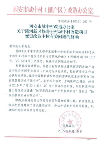 (西安市城改辦下發(fā)的《關(guān)于灞河新區(qū)穆將王村城中村改造項(xiàng)目變更改造主體有關(guān)問題的復(fù)函》)
