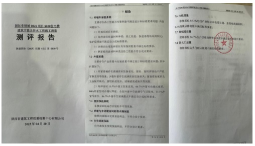 記者查閱到一份由陜西省建筑工程質(zhì)量檢測(cè)中心有限公司出具的編號(hào)陜建筑(2023)技服(政)第0010號(hào)的《測(cè)評(píng)報(bào)告》。報(bào)告顯示,DK8所建4棟樓房的房屋外墻、門窗、消防設(shè)施及所使用的電線電纜、水暖工程等均為不合格工程,使用的材料均為不合格和不達(dá)標(biāo)的材料。