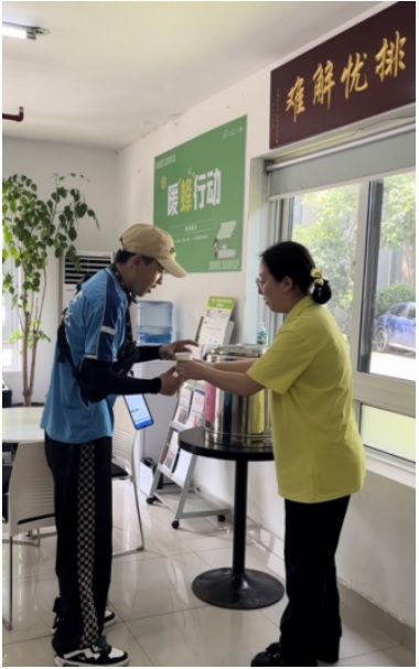 上海石泉春曉、上海金色茸城苑、上海城花新區(qū)等項(xiàng)目都相繼落地了“暖蜂驛站”,開業(yè)當(dāng)天,物業(yè)邀請(qǐng)快遞和外賣小哥前來體驗(yàn)。條形桌上擺放著物業(yè)服務(wù)人員親自為小哥準(zhǔn)備的茶水、服務(wù)站入口角落處擺放著一排排雨傘、墻面上貼著“暖蜂行動(dòng)”的畫框……看著眼前的陳列與布置,上海石泉春曉外賣員小王現(xiàn)場(chǎng)不禁感慨道:“在萬科物業(yè)在管的項(xiàng)目區(qū)送東西,業(yè)主不僅可以快速拿到自己購(gòu)買的東西,我們也能在項(xiàng)目上得到適當(dāng)?shù)男菹ⅲ能免費(fèi)喝水和充電,‘暖蜂驛站’的設(shè)立,著實(shí)讓我們方便多了。
