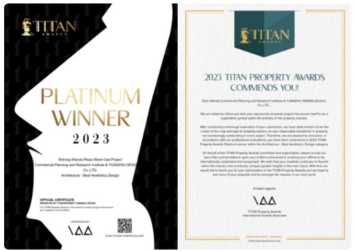 2023美國TITAN最佳商業(yè)綜合體建筑設(shè)計鉑金獎證書及獲獎函